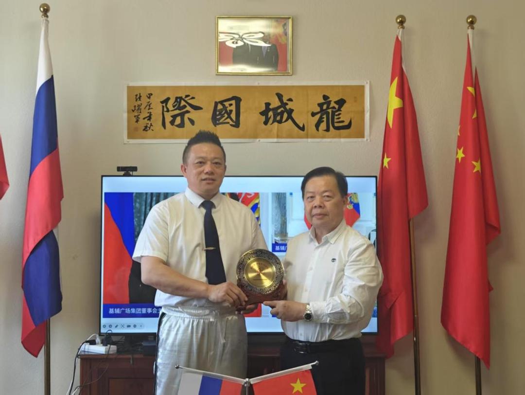 图为清远市侨商会会长黄荣孟向俄罗斯龙城集团负责人王浩赠送友好合作纪念牌。斐济共工社发