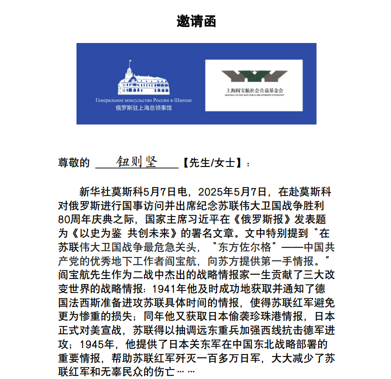 共工新闻社香港7月1日电(熊馨缘)近日,香港共工新闻社中国近代文史顾问钮则坚先生收到俄罗斯联邦驻上海总领事馆与阎宝航社会公益基金会联合发出的正式邀请,将于2025年7月26日出席在上海西郊宾馆会议中心百花厅举行的“祖国不会忘记”主题纪念活动。