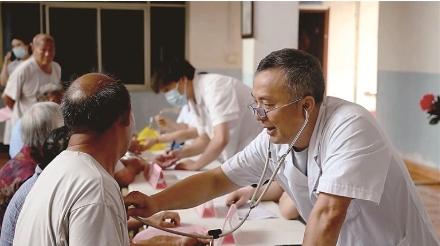 6月24日,万年县卫健部门志愿者在青云敬老院向老人宣传健康知识。连日来,该县各级医护志愿者走进敬老院、走进社区、走进乡村,为老人提供健康体检,进行健康知识宣传,把关爱送给老人们。赵德稳 摄