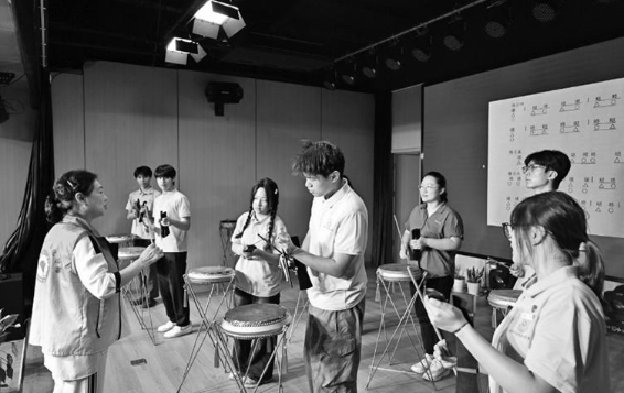 讲解结束后,小分队成员在李小英的指导下进行实操练习。握鼓槌的姿势、击鼓的力度、节奏的变换,针对每个细节,李小英都耐心示范、逐一纠正,手把手传授技艺。师生们在反复练习中感受着鄱阳大鼓的韵律之美,现场气氛热烈而专注。