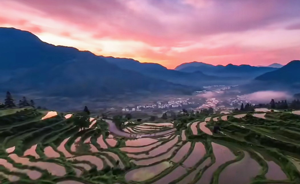 盈盈水光的梯田,被墨青的田垄如洇湿的细线一圈圈环绕。当云海漫过,梯田便如温柔的臂弯,稳稳托住流淌的白;当晚霞泼洒,它又似铺展的宣纸,静静吸纳那绚烂的红与金。