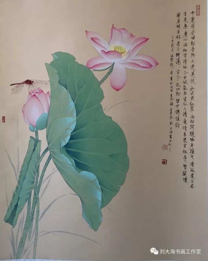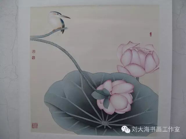 大海是开过眼界、见过世面的,因此他的笔下自然显露出一种不落俗套的格局,我所见到大海的作品以工笔花鸟居多,以通常来讲,工笔花鸟容易落入拘谨严整、细腻甜俗的套路,但大海的工笔则不然,虽然题材不外荷花、牡丹、松鹰之类,但往往给人清新脱俗之感。细察之下,方知其设色务求和谐典雅,用笔兼工带写,显是受了专业的训练,也下了一番苦功。