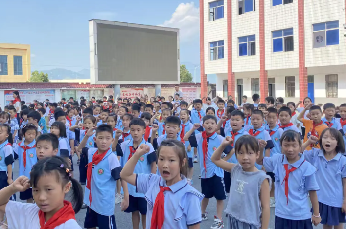 近日,上饶市广信区郑坊镇中心小学举行了少先队入队仪式。出旗曲奏响,旗手迈着铿锵步伐护送鲜艳队旗入场,全体师生肃立敬礼,目光追随旗帜。