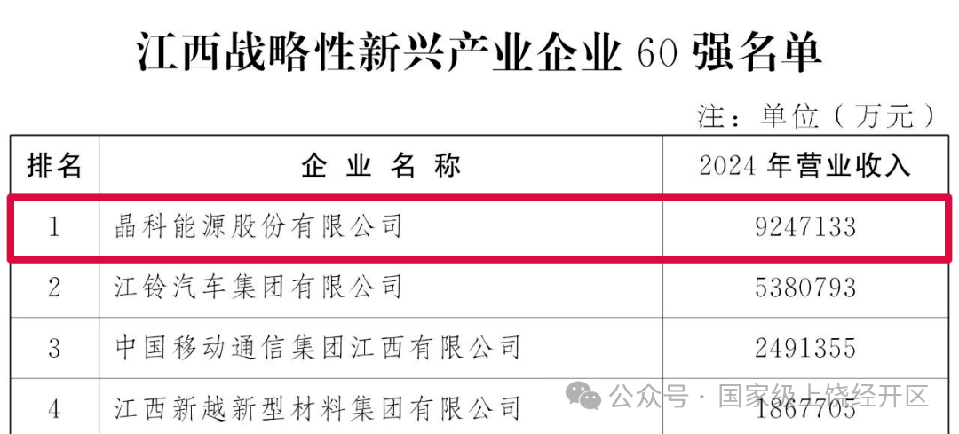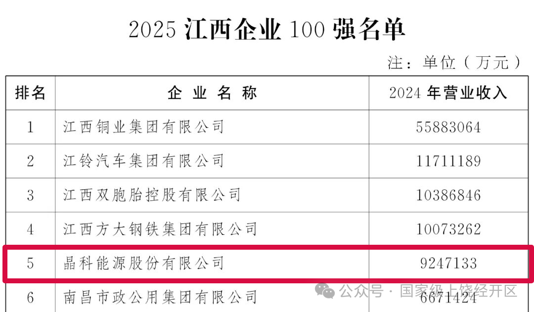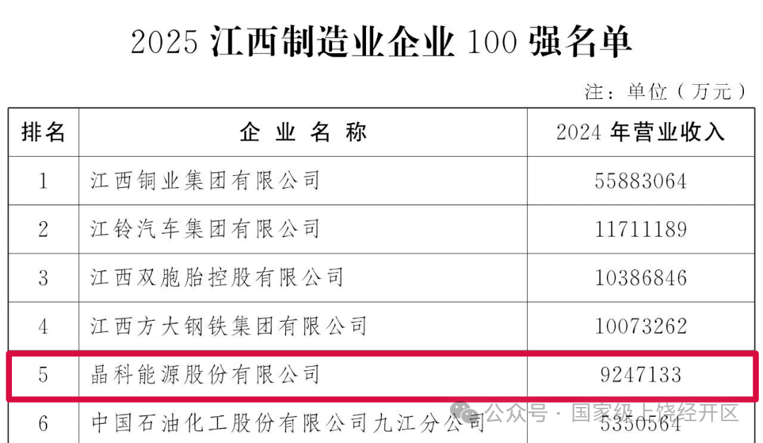 我区企业表现亮眼——晶科能源股份有限公司、上饶捷泰新能源科技有限公司同时入围2025江西企业100强、2025江西制造业企业100强以及2025江西战略性新兴产业企业60强。