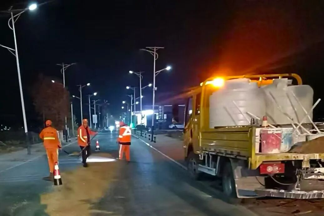 抢险人员抵达现场后,立即开展应急处置:在事发路段两端规范设置警示标志,引导过往车辆减速避让;同步采用铺洒沙子吸附油污的专业处置方式,待油污凝结后,使用扫帚、铁铲等工具对油污颗粒进行集中清理。深夜,寒风凛冽,身着橘红色工装的抢险人员顶风冒寒持续作业。经过一小时紧张处置,路面油污被彻底清理干净,该路段随即恢复正常通行,及时消除了道路安全隐患。