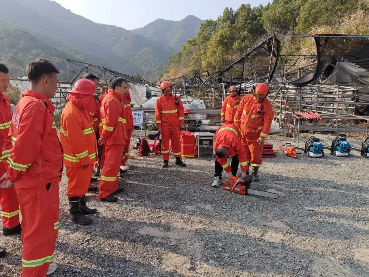 演练集结区,乡村半专业扑火队、交通管控组、信息组、火场管控组及后勤保障组整齐列队。整队完毕后,乡总指挥长宣布演练正式开始。县应急管理局专业指导员率先开展装备操作标准化演示,细致讲解风力灭火机的背负、启动及风向操控技巧,示范电锯安全使用与防火隔离带开辟流程,重点演练消防水带铺设、接口连接、压力控制及协同灭火站位等关键环节,确保队员熟练掌握实操技能。