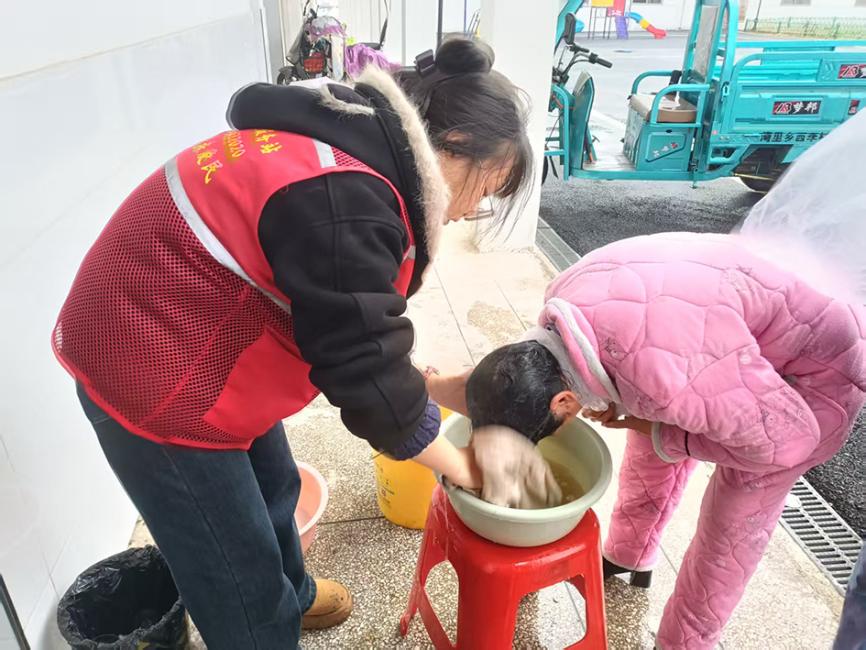 活动现场温馨洋溢。工作人员提前布置了活动场地,划分出染发区、洗发区与等候区,并张贴了喜庆的新春画纸,营造出浓厚的节日氛围。考虑到老年人的身体状况,活动特意选用温和无刺激的染发产品,并提前协调李桥村村官、妇女主任等人员协助服务,确保活动安全有序进行。