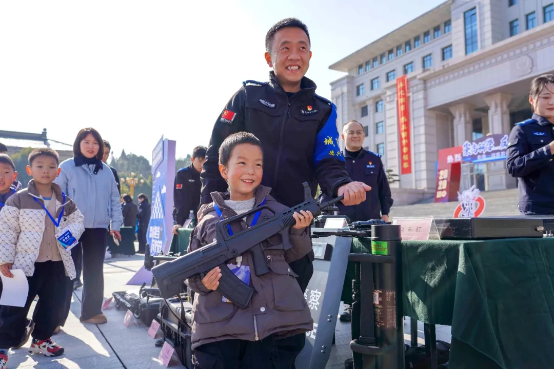 活动现场,平日多见于影视作品的警用器械和出警装备,真实展现在大家面前。孩子们好奇地围在装备展示区,特警队员耐心讲解各类器械的功能与使用场景,并指导学生们亲手操作体验。