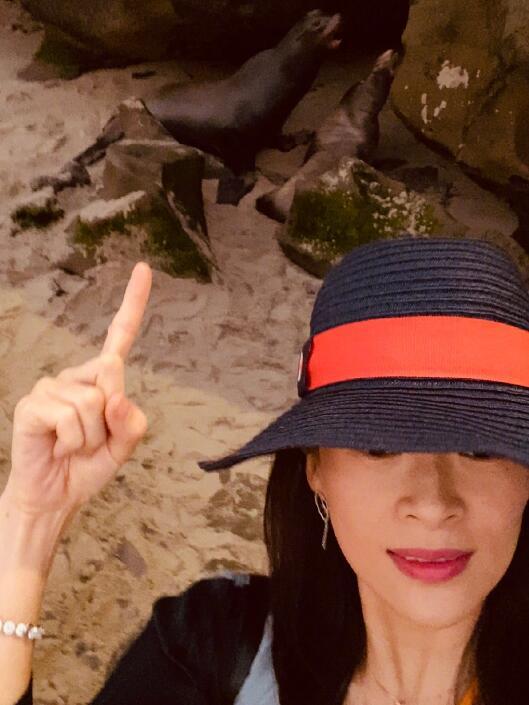 章子怡晒出与海狮的自拍,调皮的她还用手指着海狮的背影。怀孕的她仍然非常爱美,还化了大红唇妆容精致大气,真是走到哪里都有国际女星的气质。