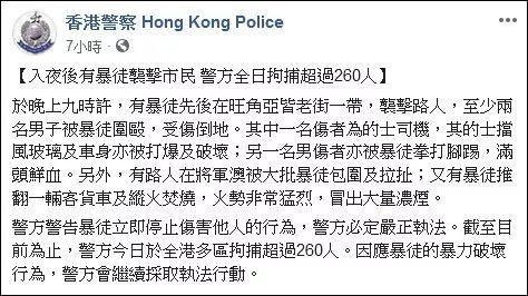 警方警告暴徒立即停止伤害他人的行为,警方必定严正执法。11日全天于全港多区拘捕超过260人。因应暴徒的暴力破坏行为,警方会继续采取执法行动。